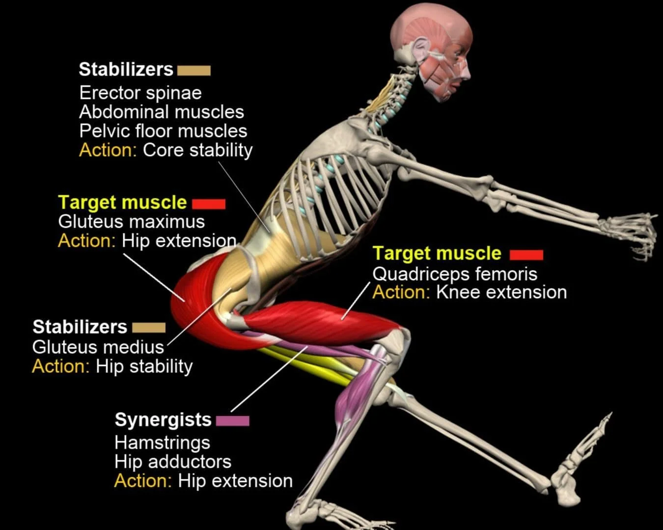 Quadriceps – Extend the knee to help you rise from the bottom of the squat.